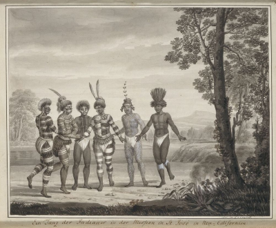 The native people of the area that includes Santa Cruz County are usually referred to today as the Ohlone. Until about 40 years ago, writers used the name Costanoan, from the Spanish word for coast. The image at right (courtesy of OAC) is a drawing of a group of native dancers at Mission San Jose, from ~1803-1807. They likely represent a different tribal group from the people who lived near Santa Cruz, but we have no pictorial record of Santa Cruz natives from such an early date.